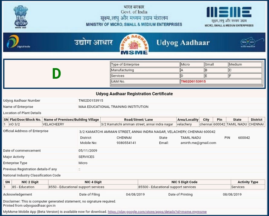 MAA School of Hotel Management has registered with MSME (Micro, Small and